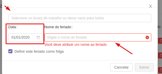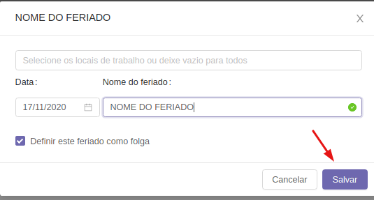 Em seguida, é necessário selecionar o local de trabalho que existirá esse feriado, caso esse feriado se aplique a todos os locais de trabalho, você poderá deixar esse campo em branco.