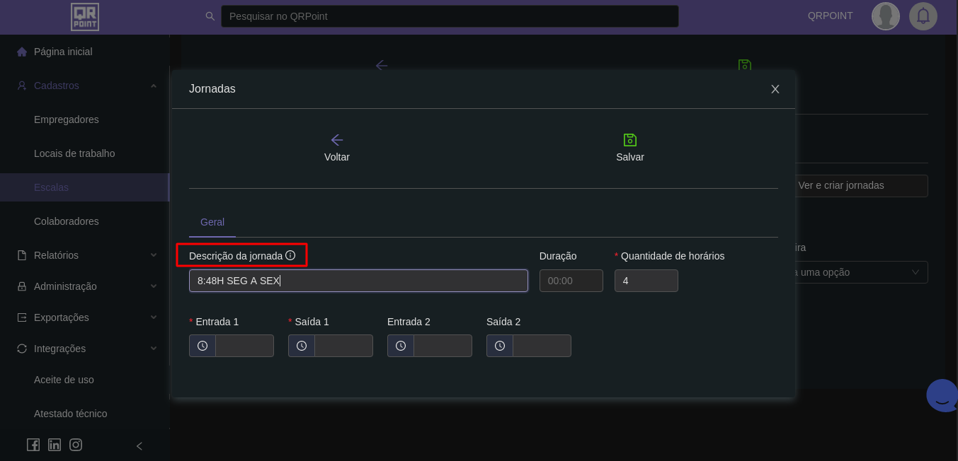Agora que inserimos uma descrição para jornada vamos inserir os horários da jornada. como mostra imagem abaixo.