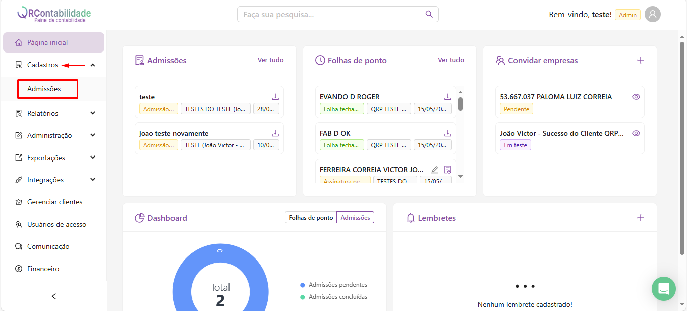 Para criar uma Nova Admissão basta acessar o QRContabilidade / Painel do Contador > ir até o Menu e clicar em CADASTROS em ADMISSÕES como mostra a imagem >