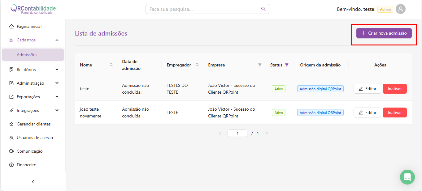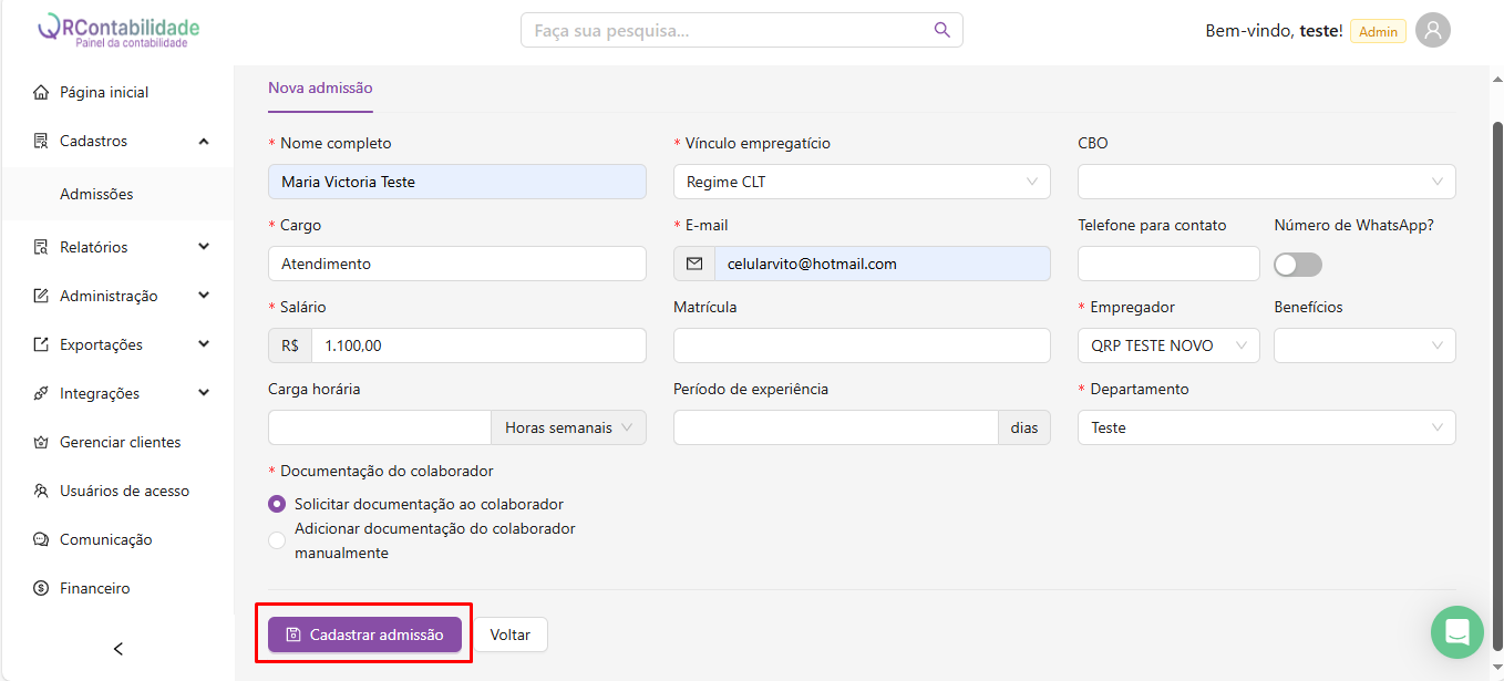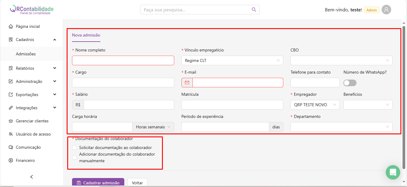 Nesse artigo você encontra todas as informações necessárias para criar uma Nova Admissão no Painel do Contador (QRContabilidade)