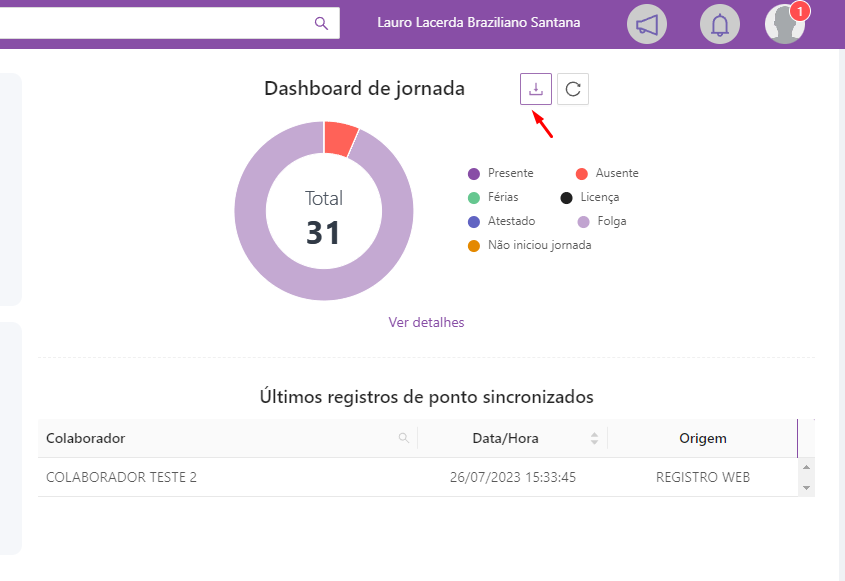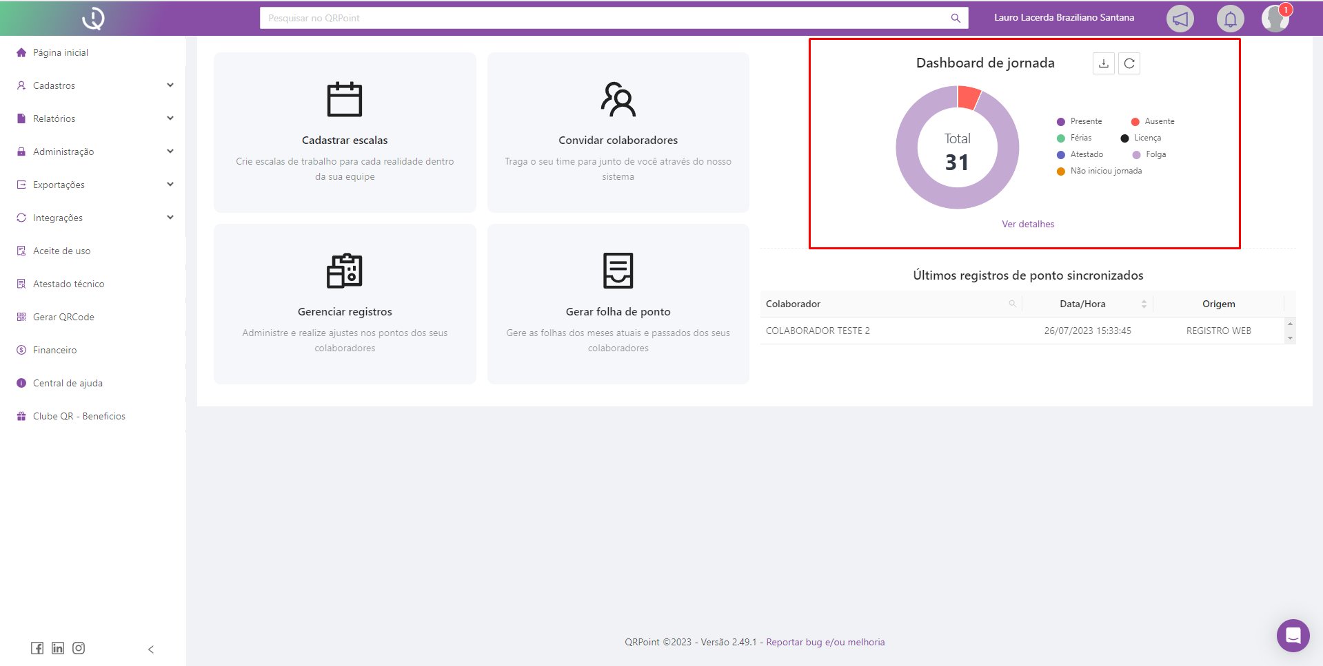 O Dashboard de jornada estará presente no canto direito da tela inicial do QRPoint, como mostra a imagem abaixo: