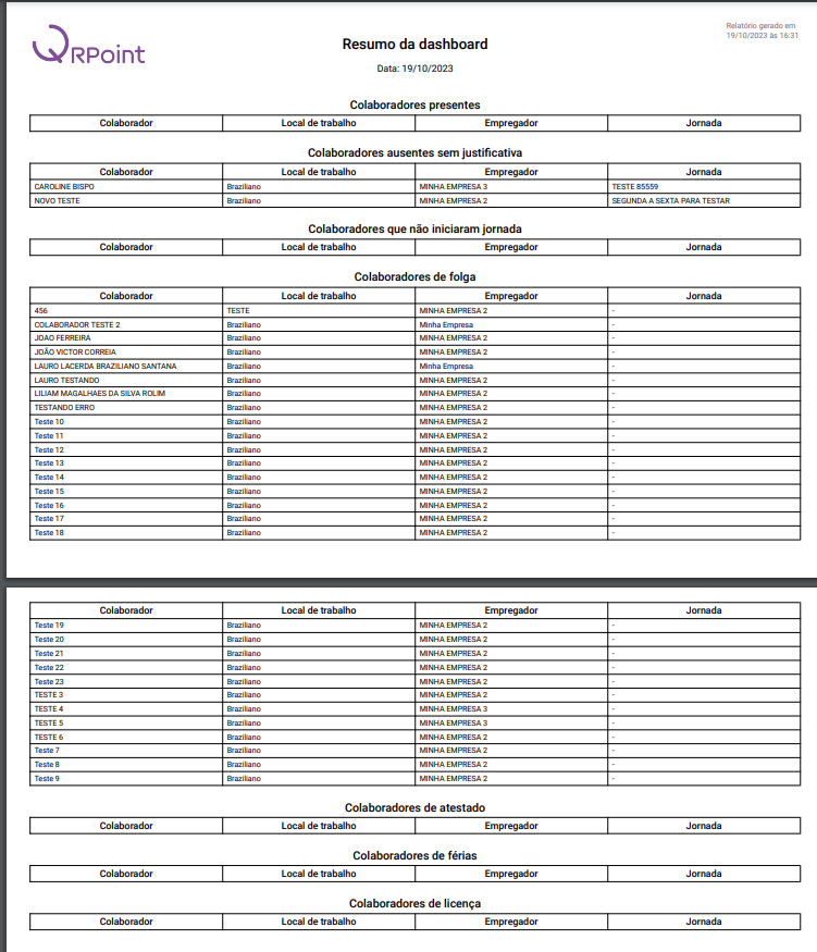 Nos detalhes, será possível ver as informações de cada colaborador individualmente, como: Nome, local de trabalho, empregador, jornada, situação.