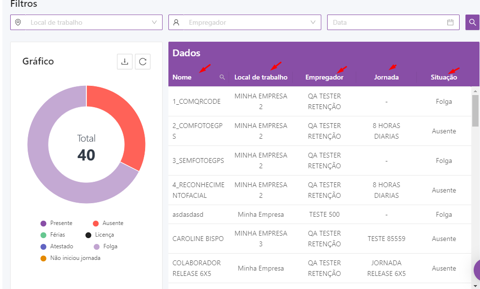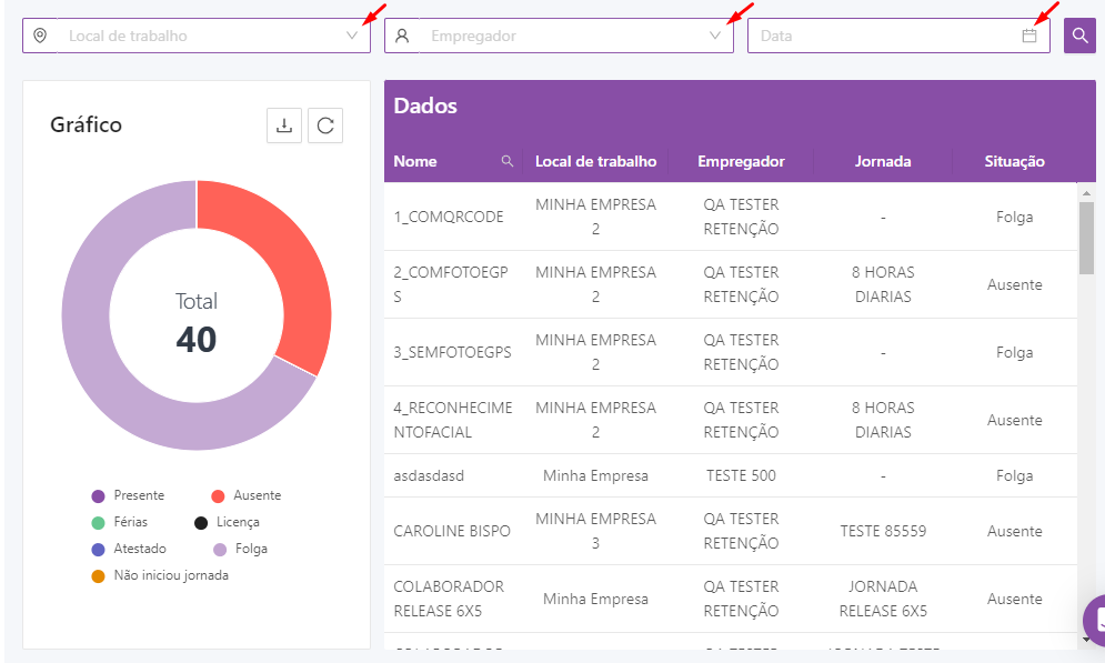 Você também poderá aplicar filtros nos colaboradores que quer visualizar, como filtro por local de trabalho, por empregador e até mesmo selecionar uma outra data para acompanhar o status dos colaboradores: