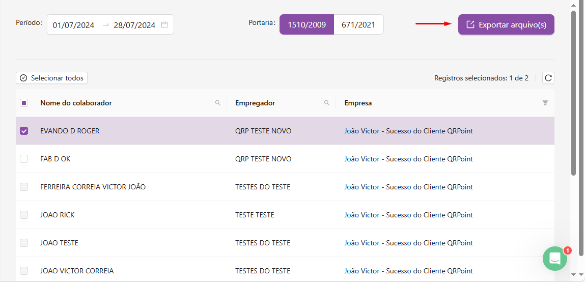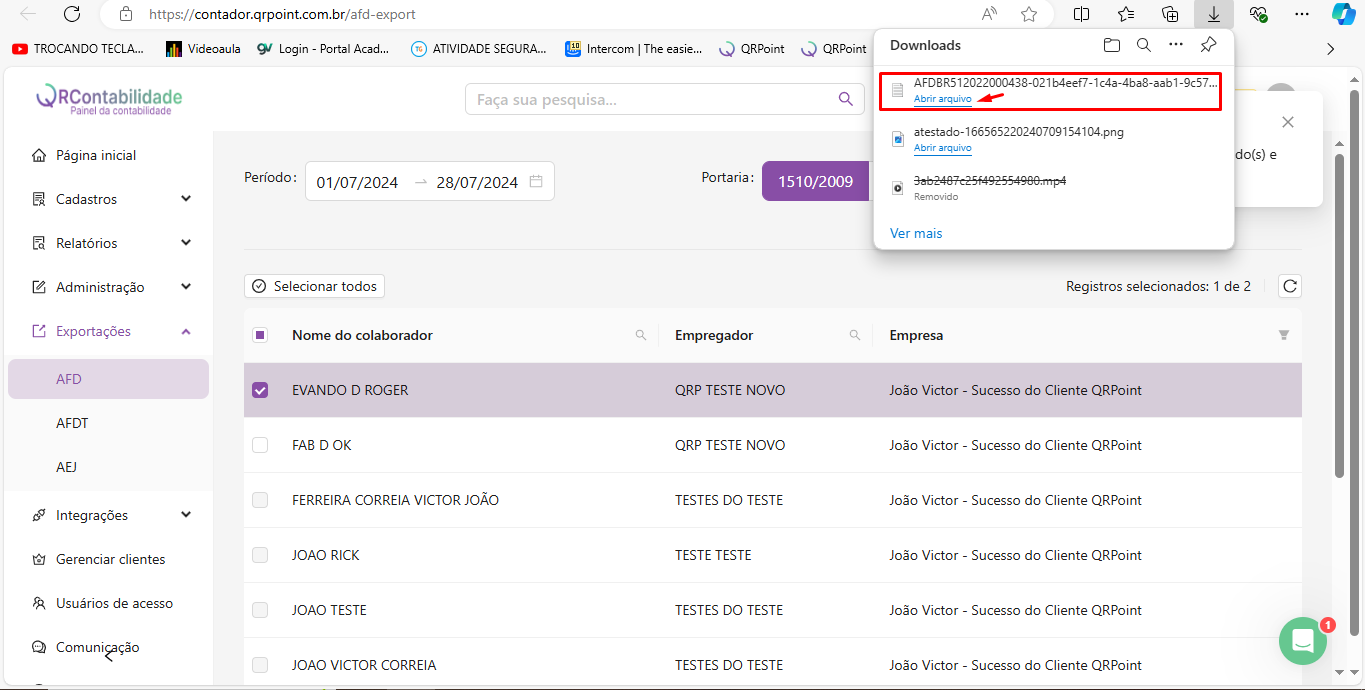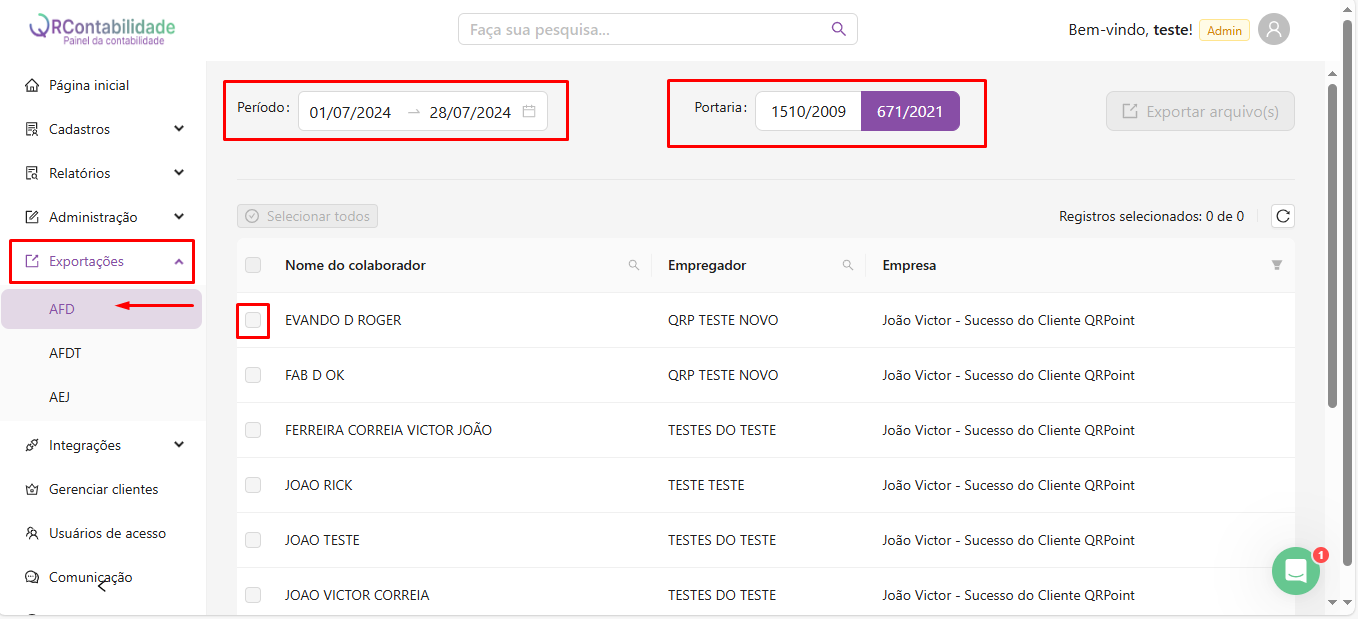 No Menu Principal você irá selecionar a aba EXPORTAÇÕES > AFD > Seleciona o colaborador > o período e o tipo da Portaria