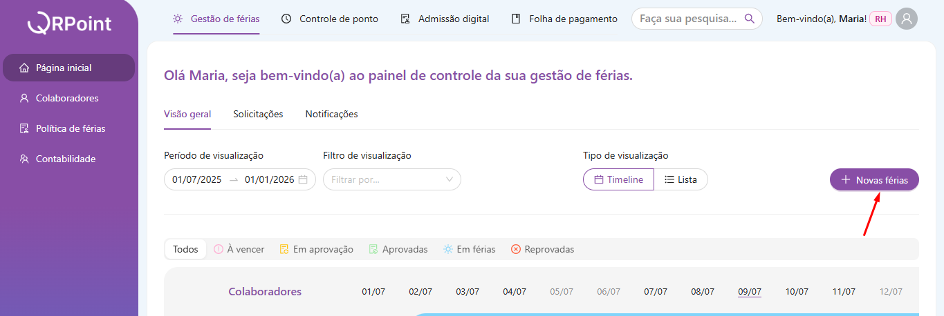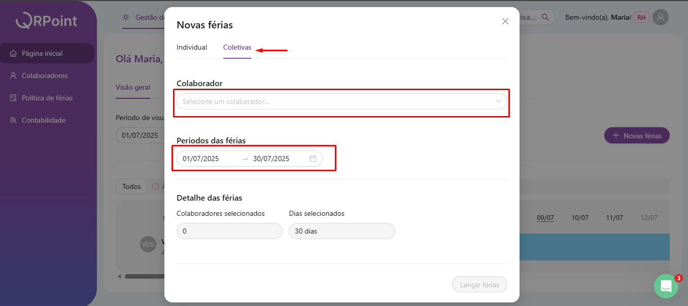 No painel de Gestão agora é possível lançar férias coletivas para os colaboradores, basta acessar ao Painel de Gestão de férias > ir em Novas férias.