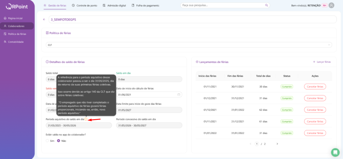 Uma dica de ferramenta em amarelo será exibido no campo “Período Aquisitivo” com o seguinte texto:
