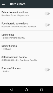 Nessa tela, basta marcar como ativo as opções Data e hora automáticas e Fuso horário automático.