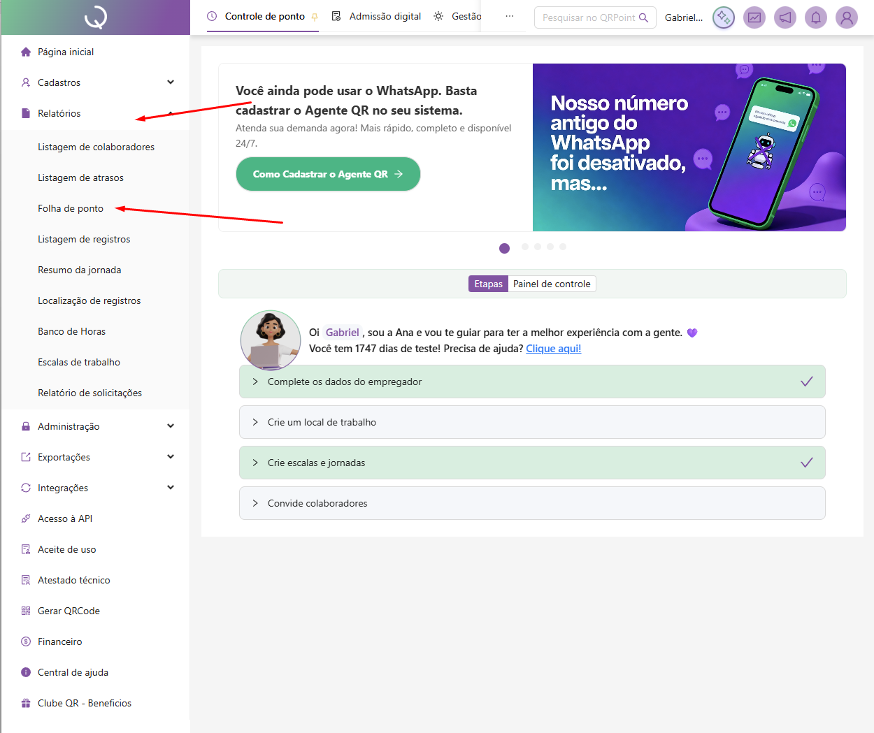 O primeiro passo é acessar o menu em RELATÓRIOS>>FOLHA DE PONTO: