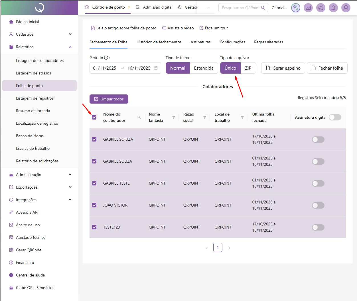 Em seguida, na tela de folha de ponto, após selecionar o período, os colaboradores e o tipo de folha, você irá selecionar a opção de “Único” no campo “Tipo de arquivo”
