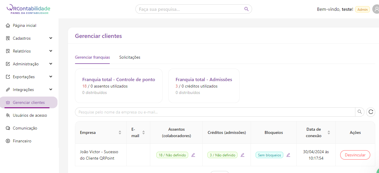 Gerencie clientes, defina limites de usuários e admissões, controle acessos e desvincule clientes no painel do contador.