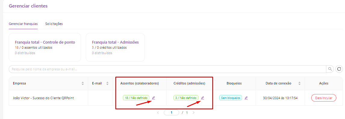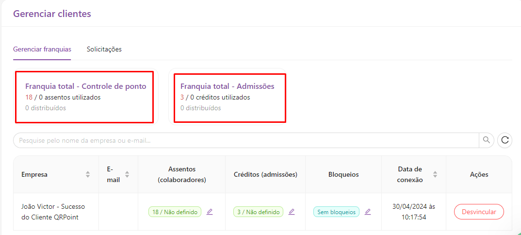 Em ''Franquia total - controle de ponto'' e ''Franquia total - Admissões'', temos a quantidade total de assentos utilizados por todos os clientes e quantos a contabilidade ainda pode ter no plano atual, o mesmo serve ''Franquia total - Admissões'' com relação aos créditos utilizados.