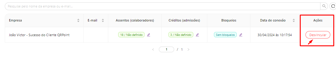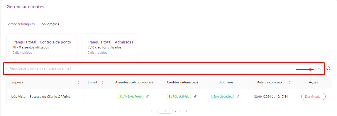 Logo abaixo, é possível pesquisar a empresa (Cliente) pelo nome da empresa ou pelo e-mail.