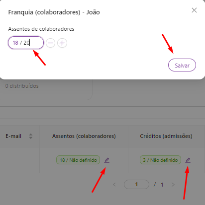Na tela de gerenciar clientes logo abaixo de ''Assentos (colaboradores)'' e ''Créditos (admissões)'', clicando no lápis, o contador poderá ajustar a quantidade de colaboradores e de admissões que o cliente pode cadastrar ou contratar utilizando o Admissão digital, como no exemplo abaixo.
