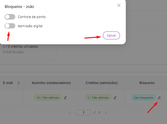 Em bloqueios, clicando no lápis na tela de gerenciar clientes, o contador pode realizar bloqueios de acesso aos sistemas de controle de ponto e o Admissão digital, conforme a imagem abaixo: