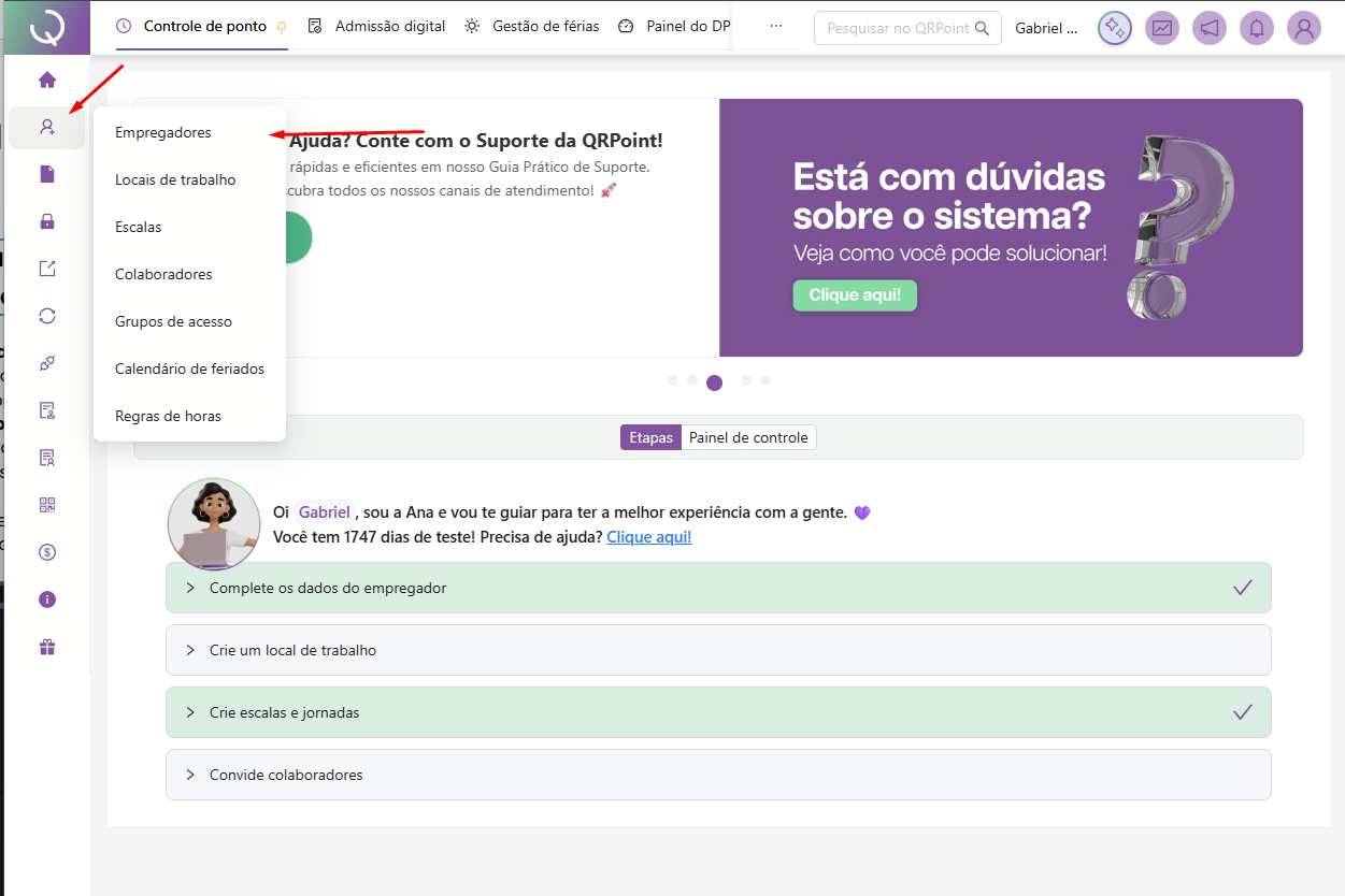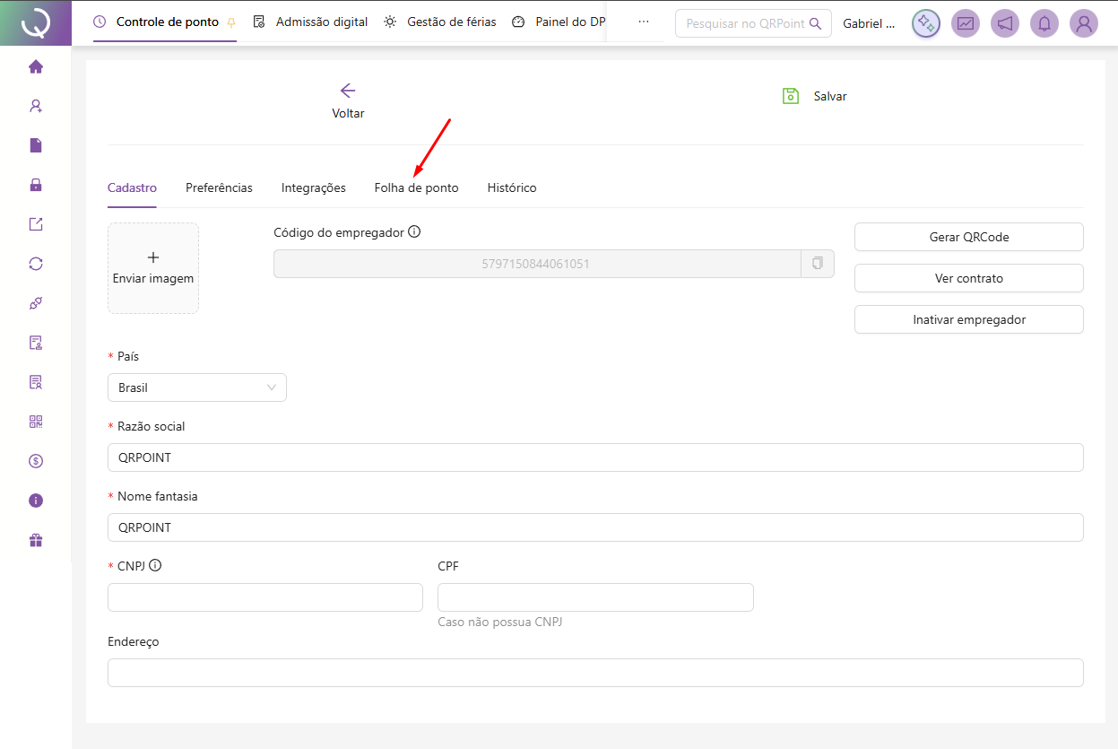 Para habilitar essa função selecione a opção MENU > CADASTROS > EMPREGADORES. Em seguida, selecione o empregador que deseja habilitar essa opção.