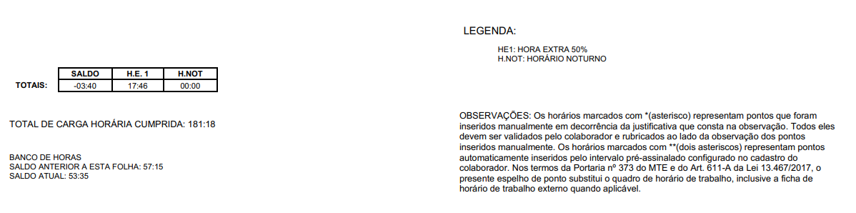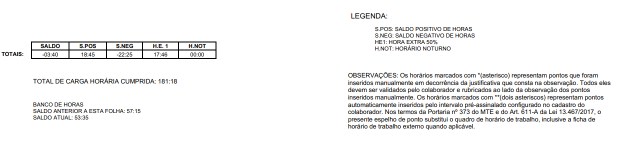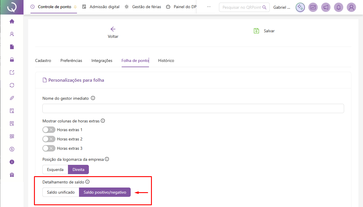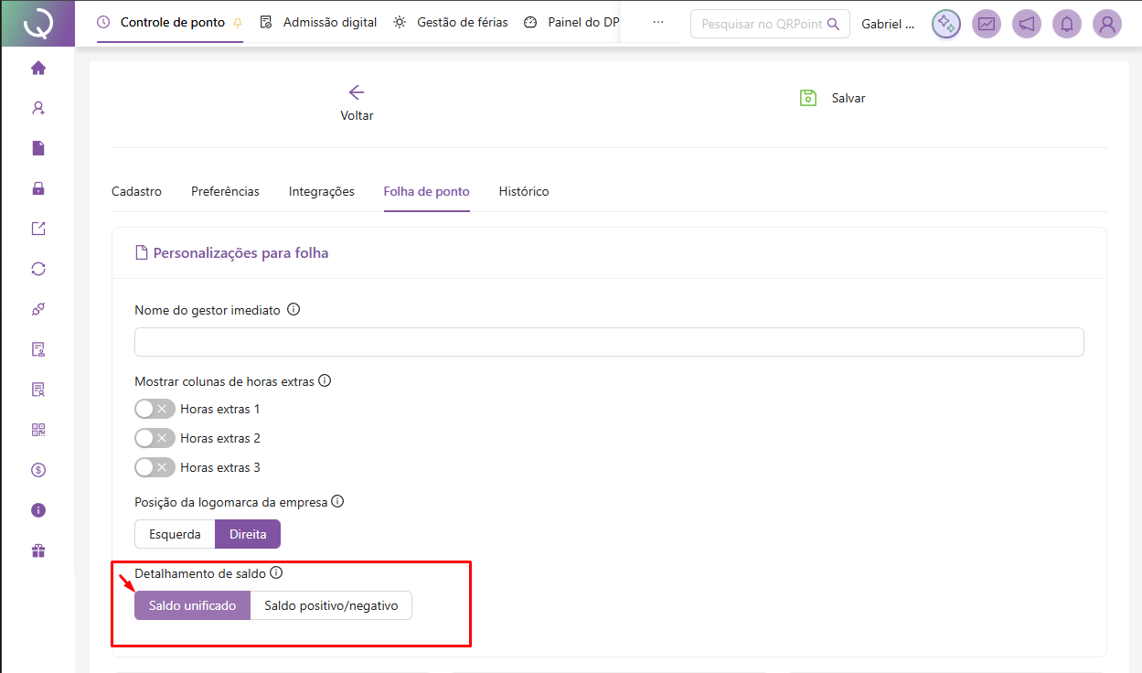 O parâmetro Detalhamento do saldo possui duas opções que definem como o saldo diário será exibido na folha de ponto, podendo ser "saldo unificado", onde o saldo será exibido em uma coluna apenas (como saldo negativo + saldo positivo = saldo unificado), ou, como "saldo positivo/negativo", que exibirá duas colunas distintas, uma apenas para o saldo positivo e outra para o negativo (na área de totais ainda haverá o total unificado, além dos outros dois).