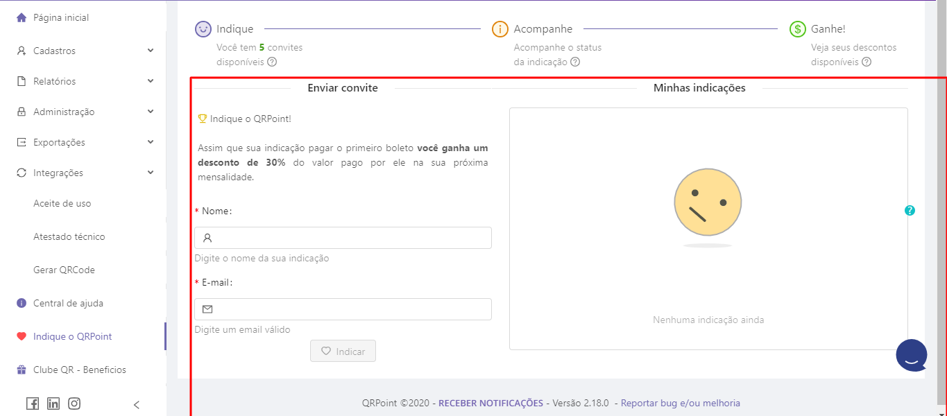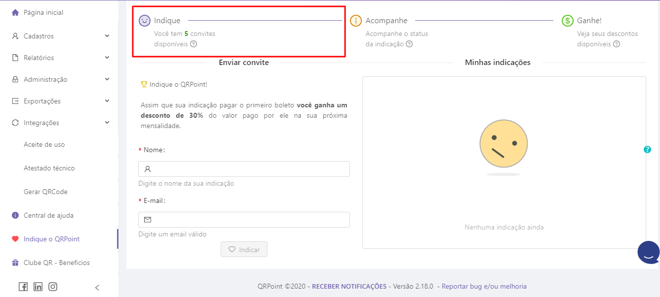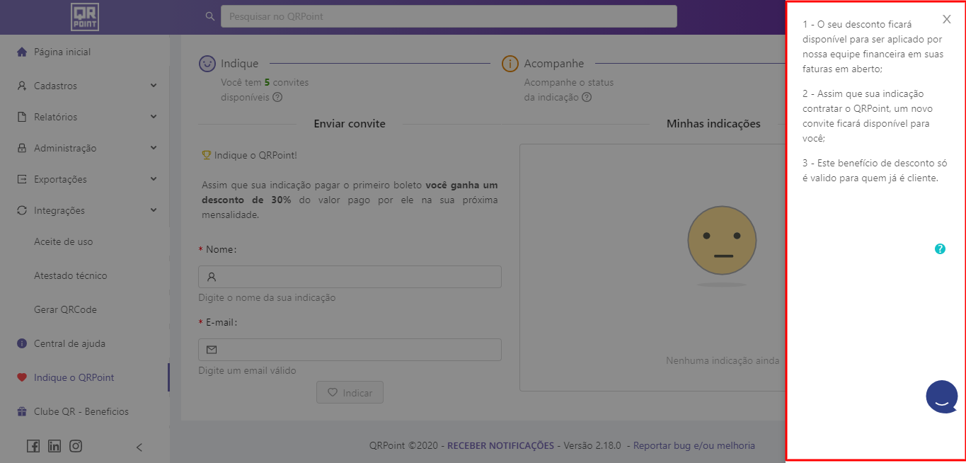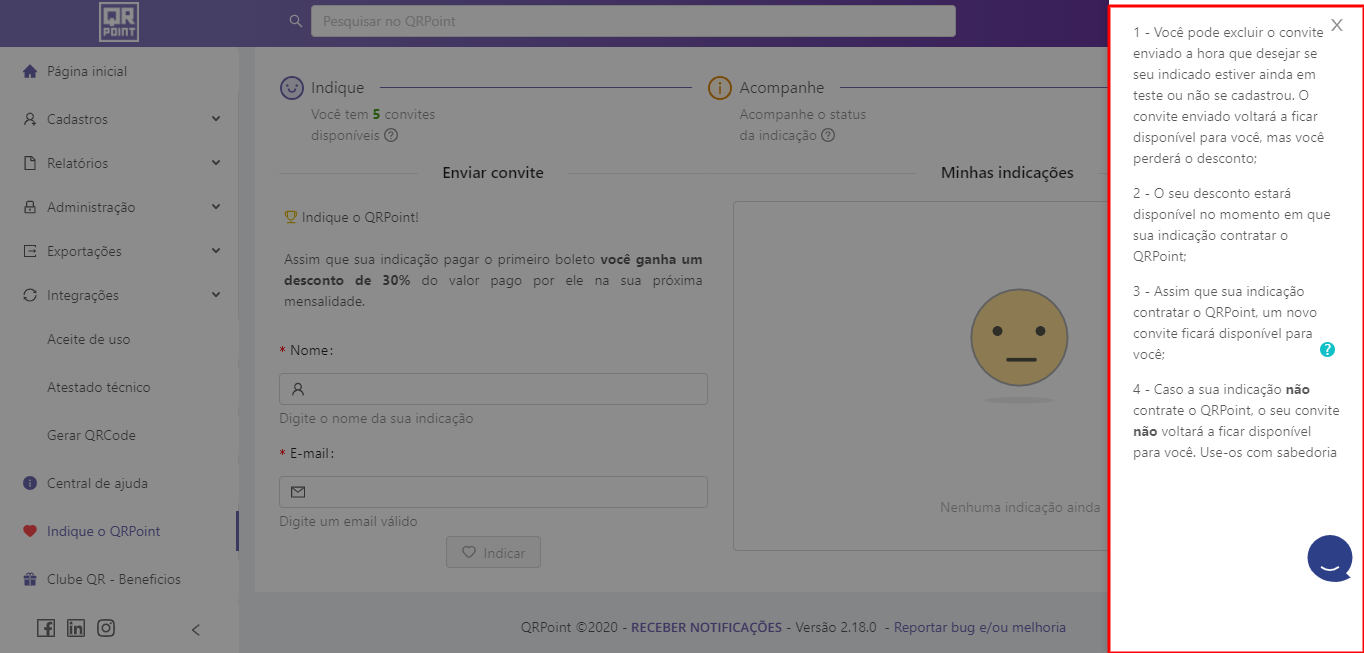 A opção de indicar usuário é uma das telas presentes no sistema web, onde permite ao cliente fazer a indicação de novos usuários para o QRPoint. Quando uma indicação contrata o QRPoint e se torna um novo usuário, você receberá um desconto de 30% do valor pago pelo indicado na contratação do sistema, assim como um convite de volta.