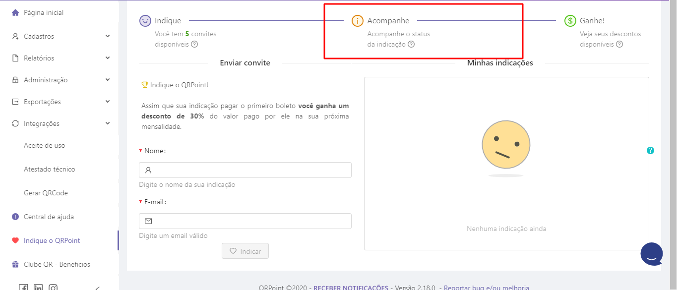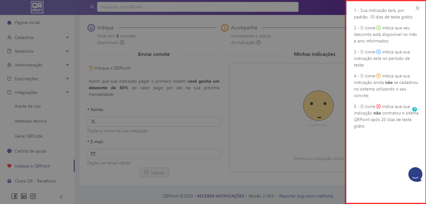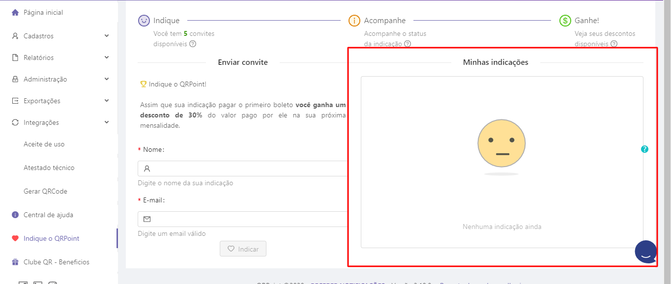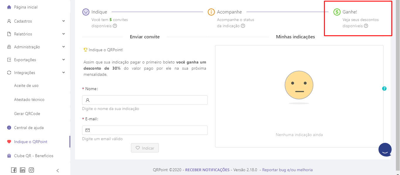 A opção de indicar usuário é uma das telas presentes no sistema web, onde permite ao cliente fazer a indicação de novos usuários para o QRPoint. Quando uma indicação contrata o QRPoint e se torna um novo usuário, você receberá um desconto de 30% do valor pago pelo indicado na contratação do sistema, assim como um convite de volta.