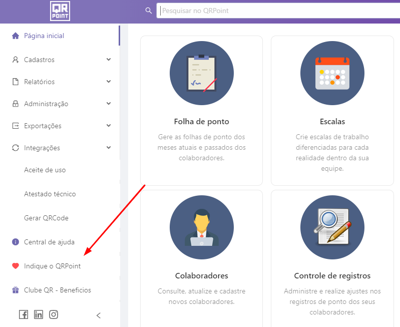 O primeiro passo é acessar o menu em indique o QRPoint.