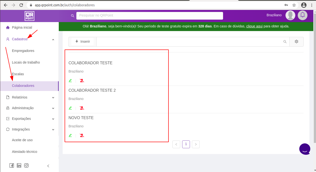 Existem duas formas de aplicar o intervalo pré-assinalado. Uma delas é adicionar esse intervalo de forma individual. O primeiro passo para isso é ir no menu em CADASTROS>>>COLABORADORES e escolher o colaborador que quer aplicar o intervalo: