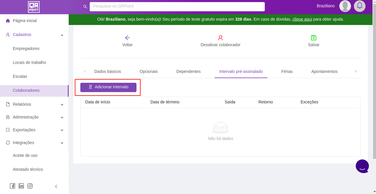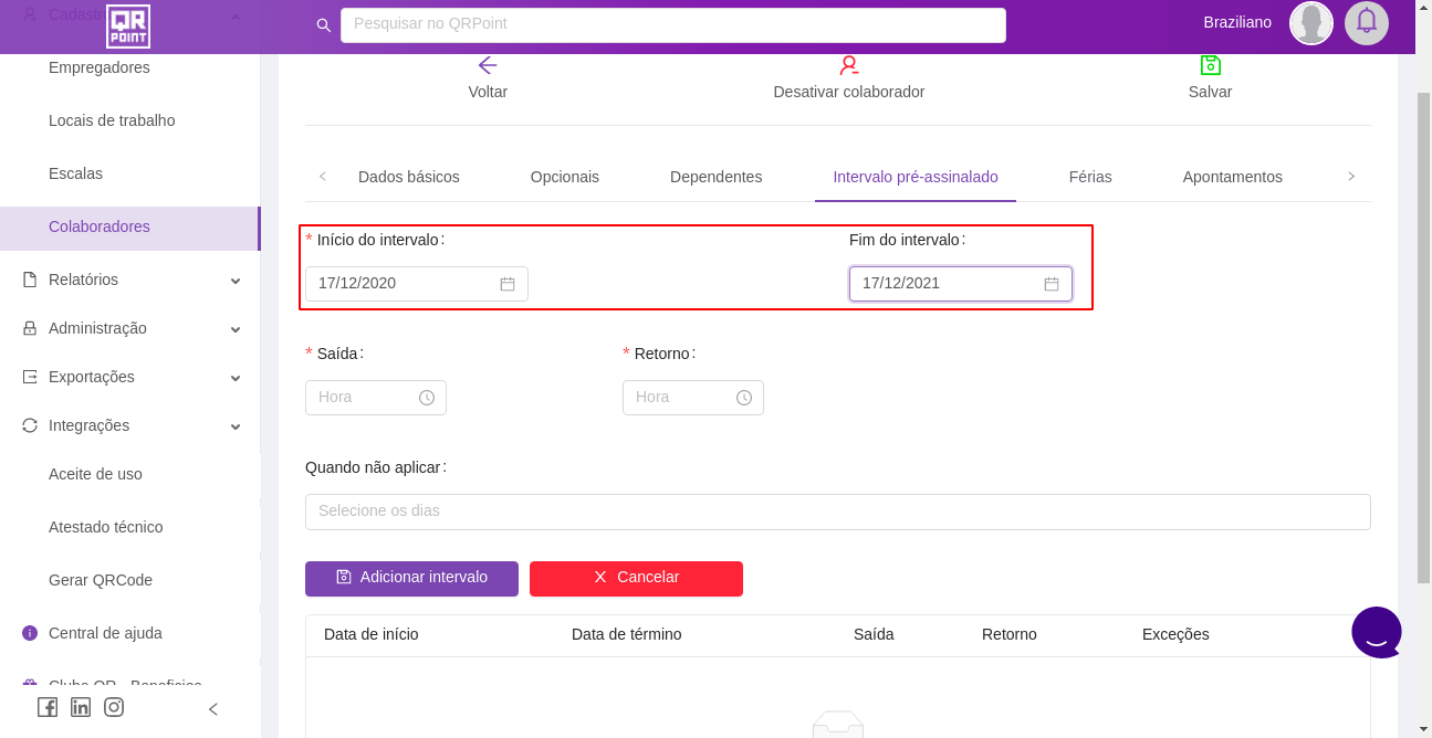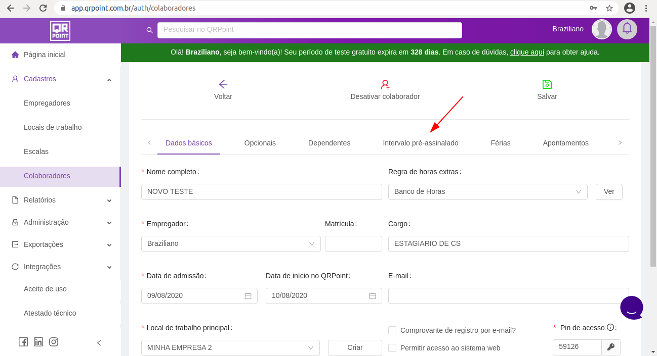 Em seguida, o sistema irá abrir a tela de cadastro do colaborador, onde você deve ir na opção de "intervalo pré-assinalado", que fica na parte superior da tela: