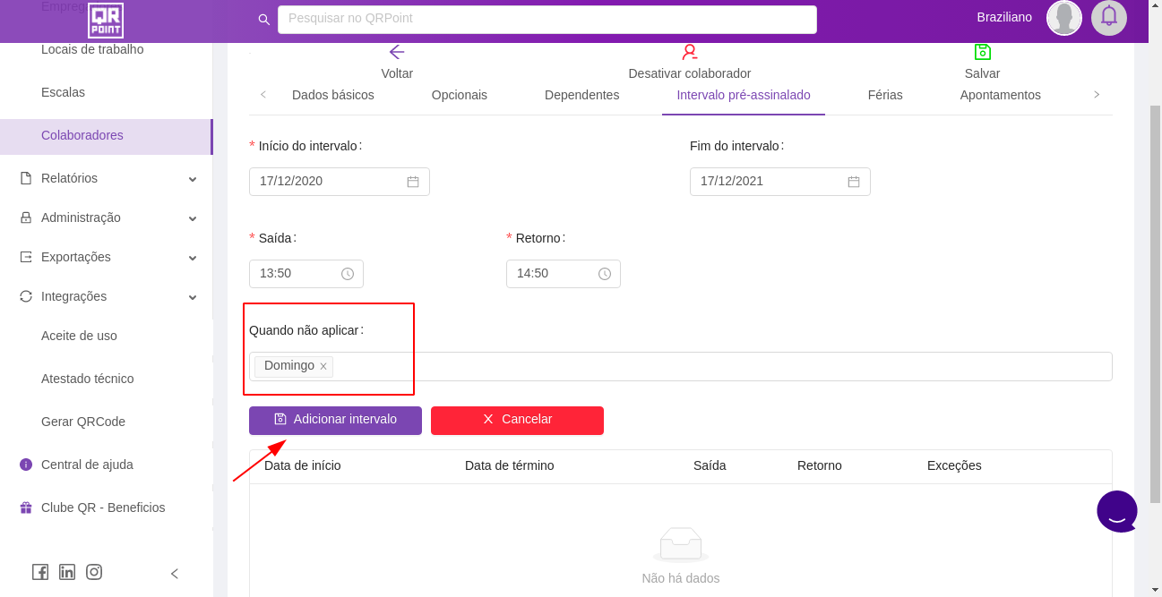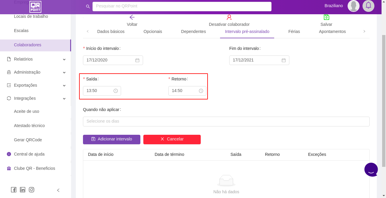 Por fim, caso queira escolher um dia da semana que esse intervalo não se aplica, basta escolher o dia na opção "Quando não aplicar" e em seguido clicar em "Adicionar Intervalo", para aplicar o intervalo pré-assinalado nesse colaborador: