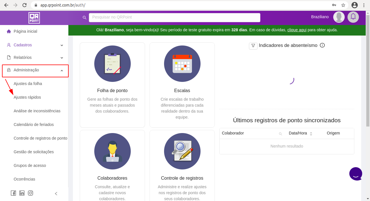 O primeiro passo dessa etapa é ir no menu em "ADMINISTRAÇÃO">>>"AJUSTES RÁPIDOS", como evidenciado abaixo:
