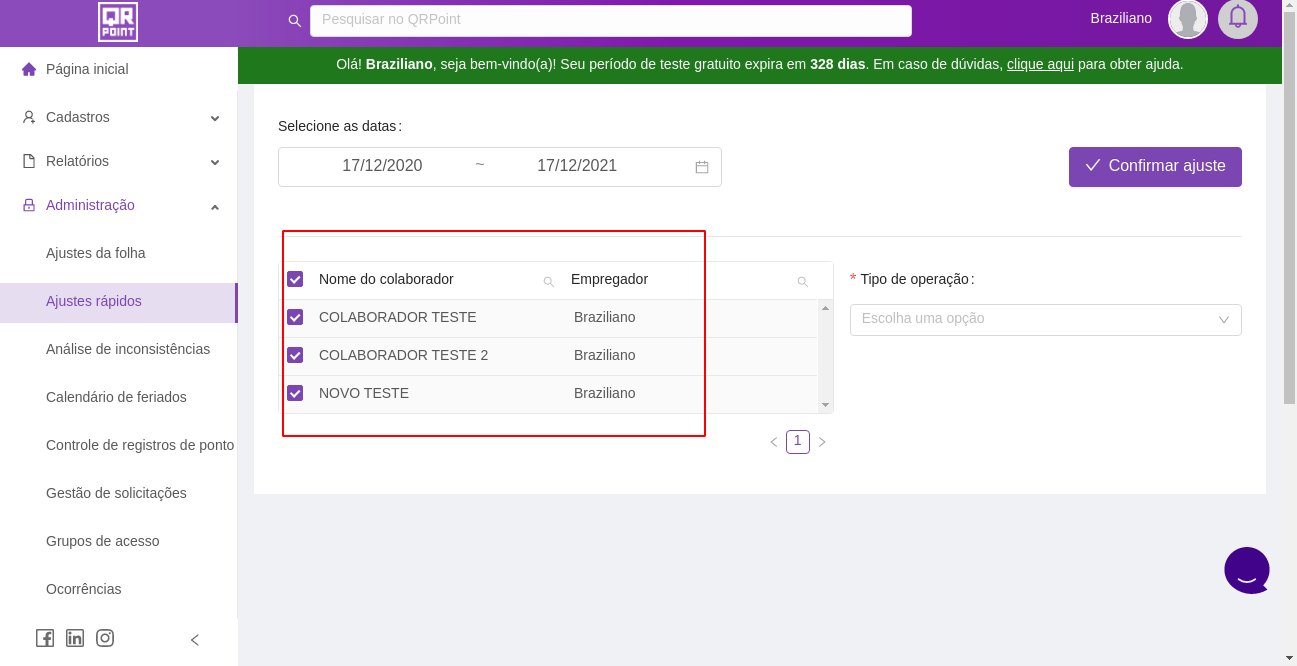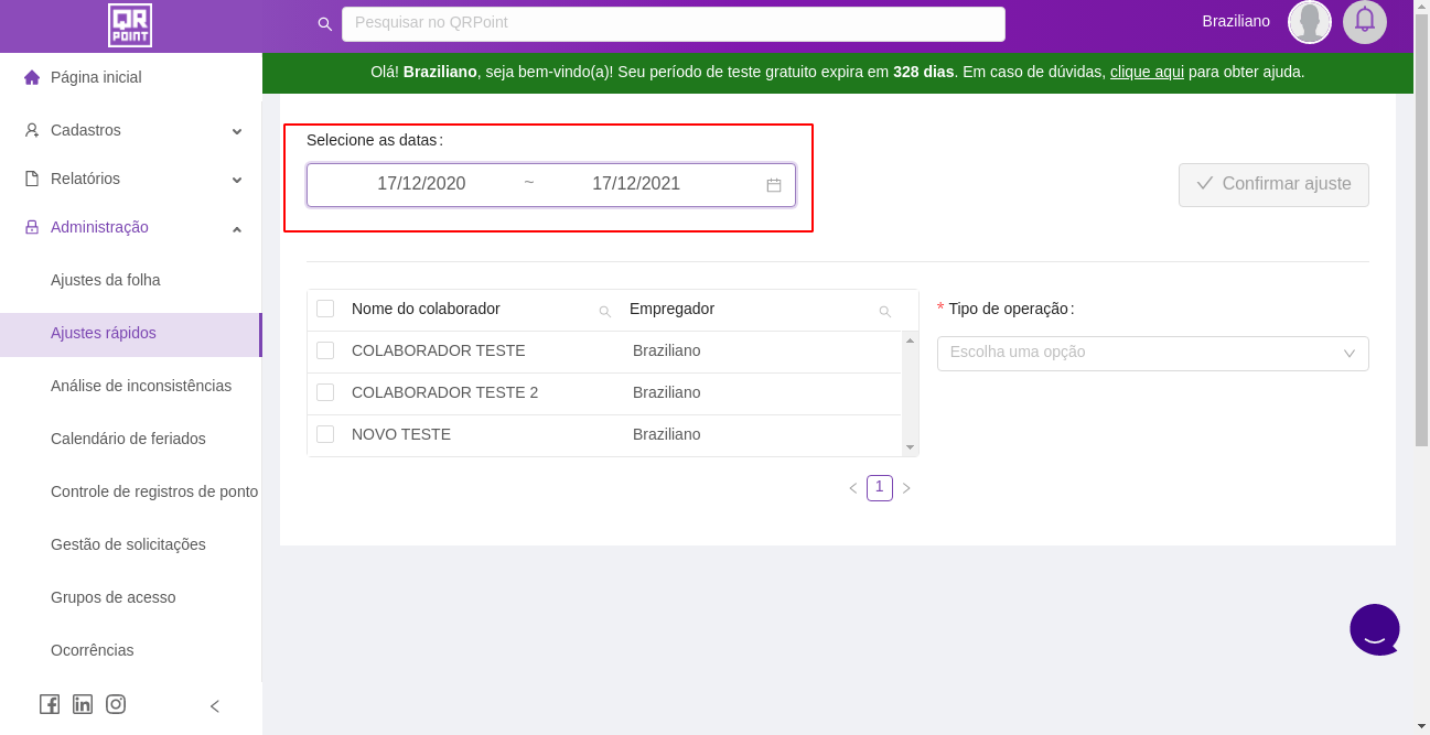 Na próxima etapa o sistema abrirá a página para aplicação de ajustes rápidos. Para configurar primeiro você deverá escolher o período em que esse ajuste será aplicado, dessa vez sendo necessário estabelecer a data de início e de fim da aplicação na aba de "selecionar datas":