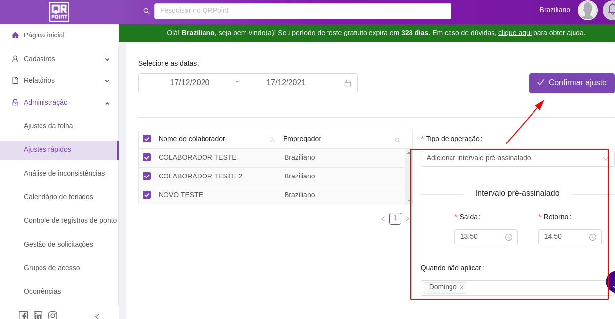 Opa!! Ainda não acabamos, como dito no início essa foi apenas uma das maneiras de inserir o intervalo. Agora iremos seguir com os passos para configurar o intervalo pré-assinalado em larga escala para vários ou todos os colaboradores.