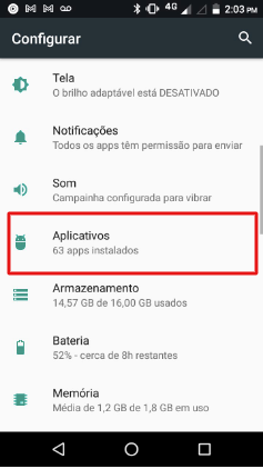 Acesse o menu do seu aparelho em CONFIGURAÇÃO > APLICATIVOS, como mostra a imagem abaixo.