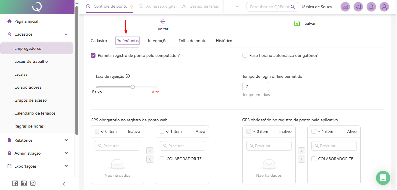 Logo em seguida, abrirá a tela das preferências para o registro de ponto do seu colaborador.