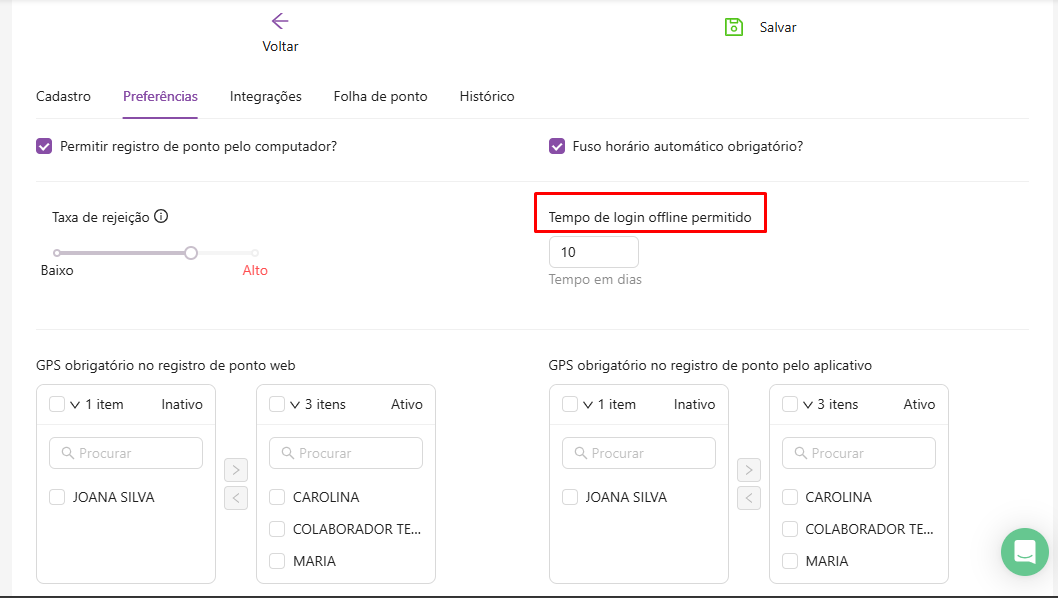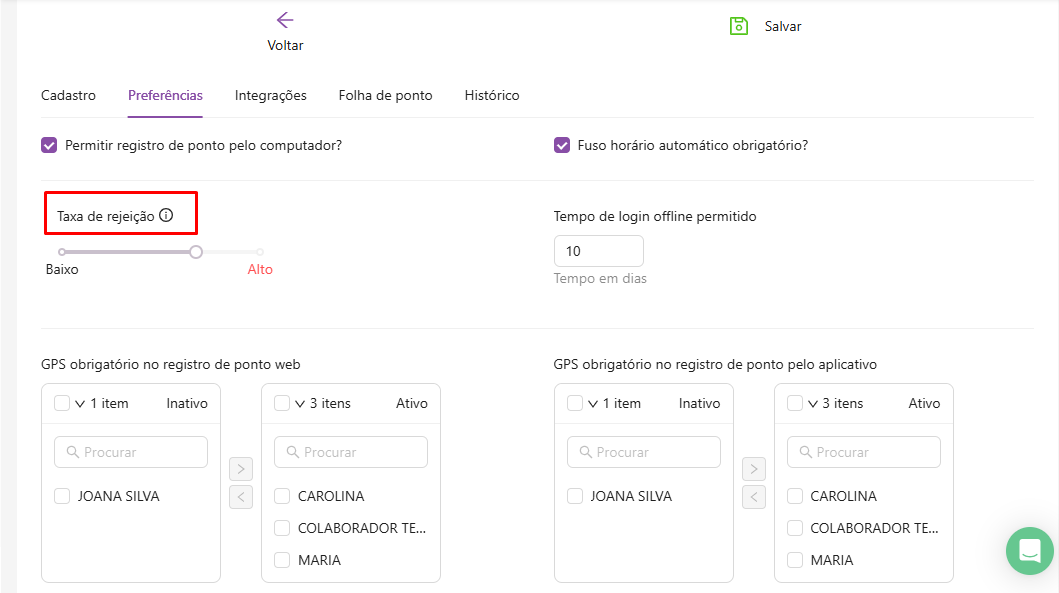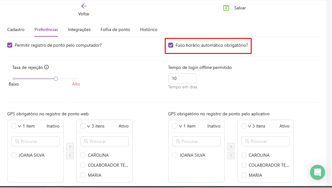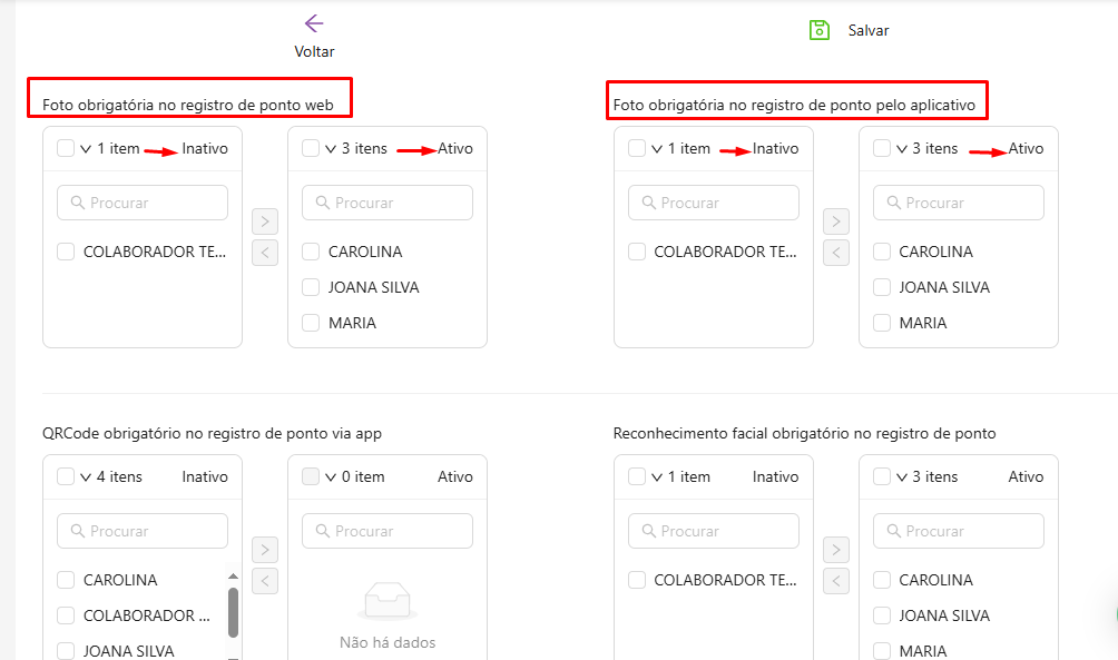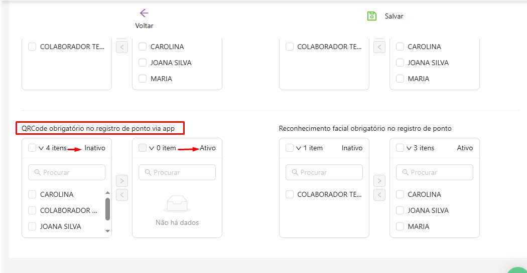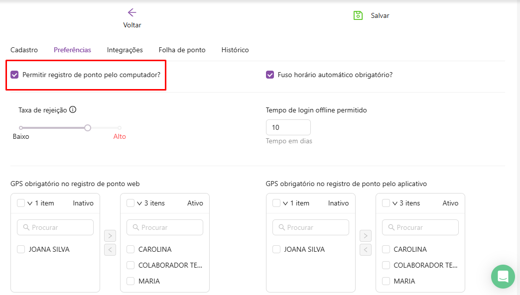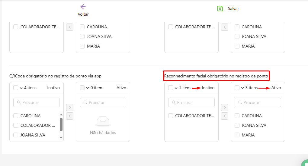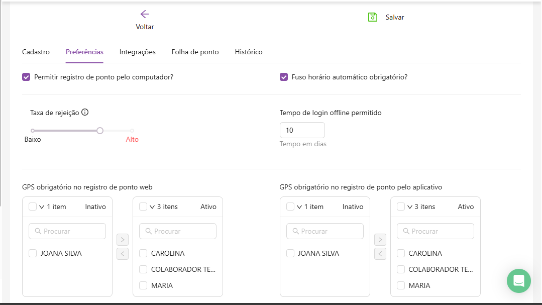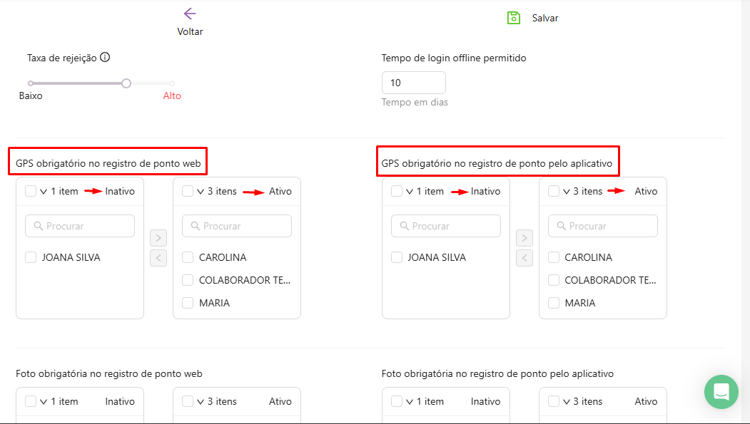 Lembrando que o gestor pode ter a opção de ativar e inativar apenas uma opção ou as duas opções, assim como também pode escolher apenas alguns colaboradores ou todos.