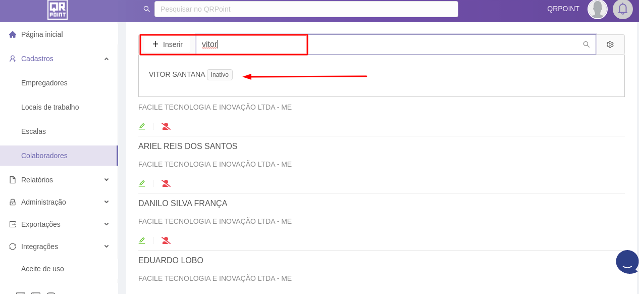 3º PASSO: Em Inserir colocar o nome do colaborador que deseja reativar