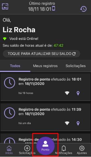 Logo depois, irá abrir o seu painel principal, onde para registrar o seu ponto, basta clicar no botão Ponto, na parte inferior da tela.