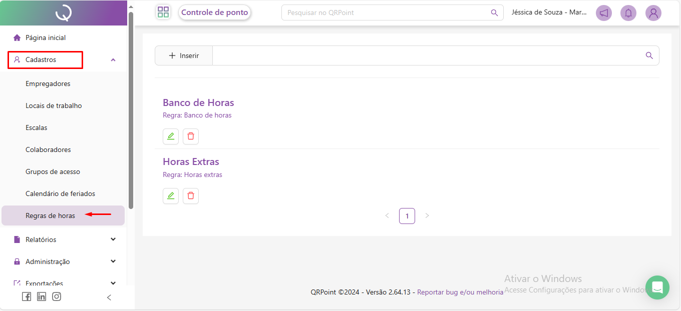 Acesse CADASTROS > REGRAS DE HORAS > BANCO DE HORAS.