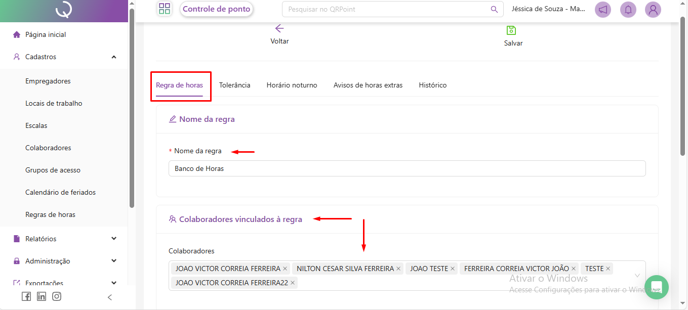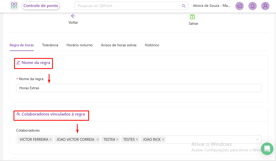 Preencha os campos obrigatórios (Nome da regra e Colaboradores vinculados).