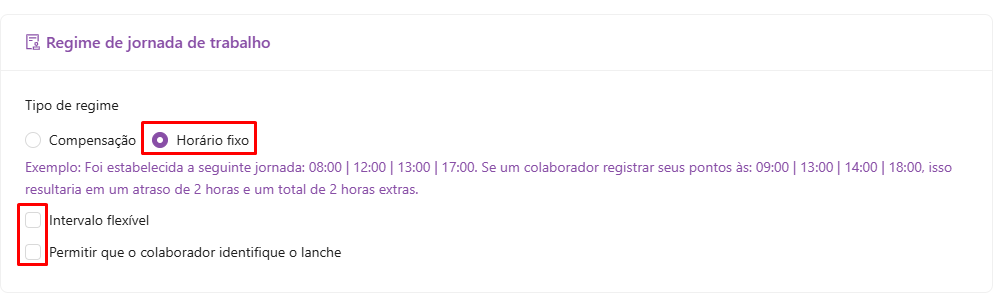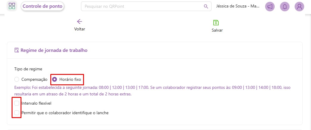 Em horário fixo temos duas opções que podem ser marcada, se o colaborador será permitido a ter um intervalo flexível e/ou se será permitido que o colaborador identifique o lanche.