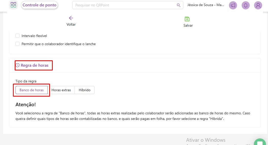 Apos configurar o banco de horas, clique em Salvar para ativar a regra.