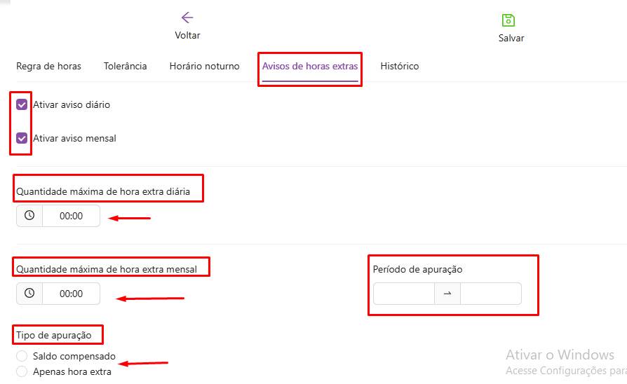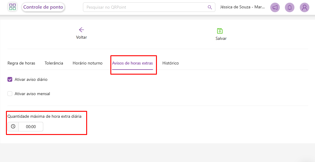 Aviso diário: Notifica quando o limite de horas extras diárias é ultrapassado.