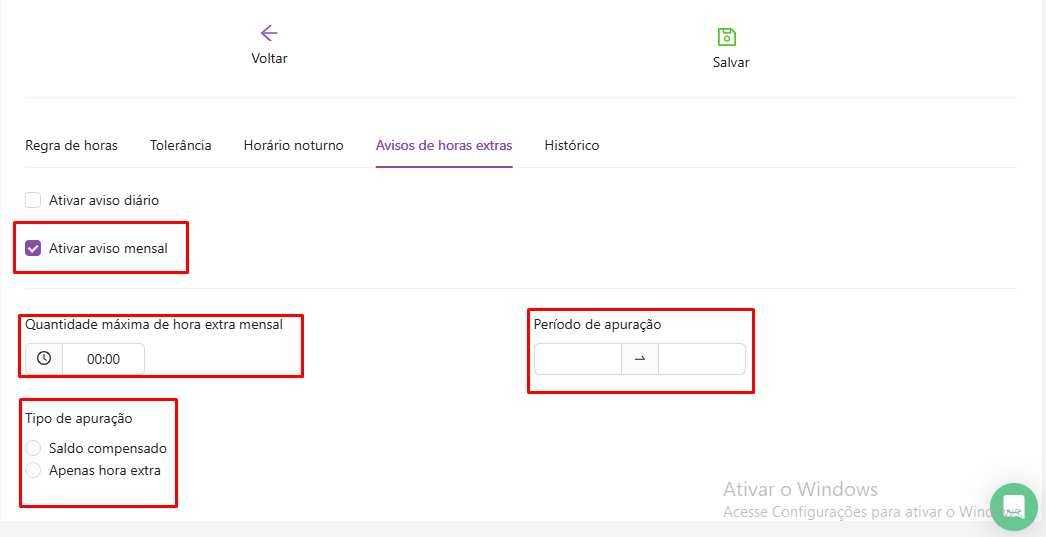 Aviso mensal: Notifica quando o limite mensal de horas extras é ultrapassado.