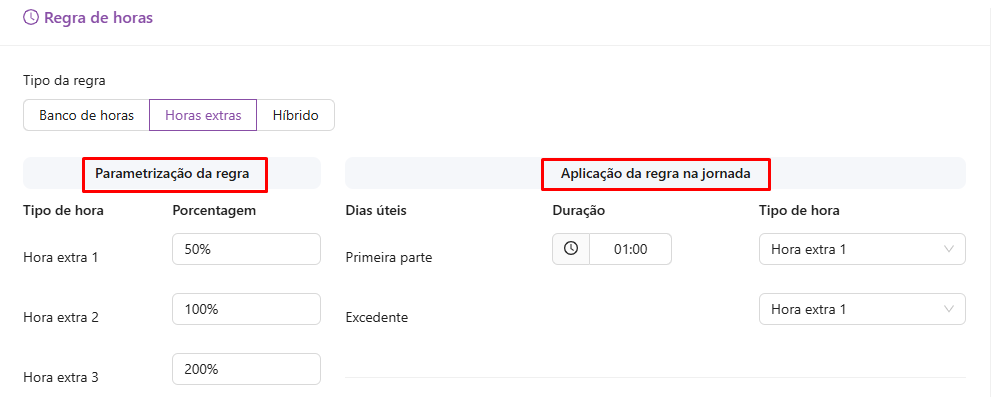 Defina as porcentagens da regra de horas extras (mantendo os valores padrões ou personalizando conforme necessidade).