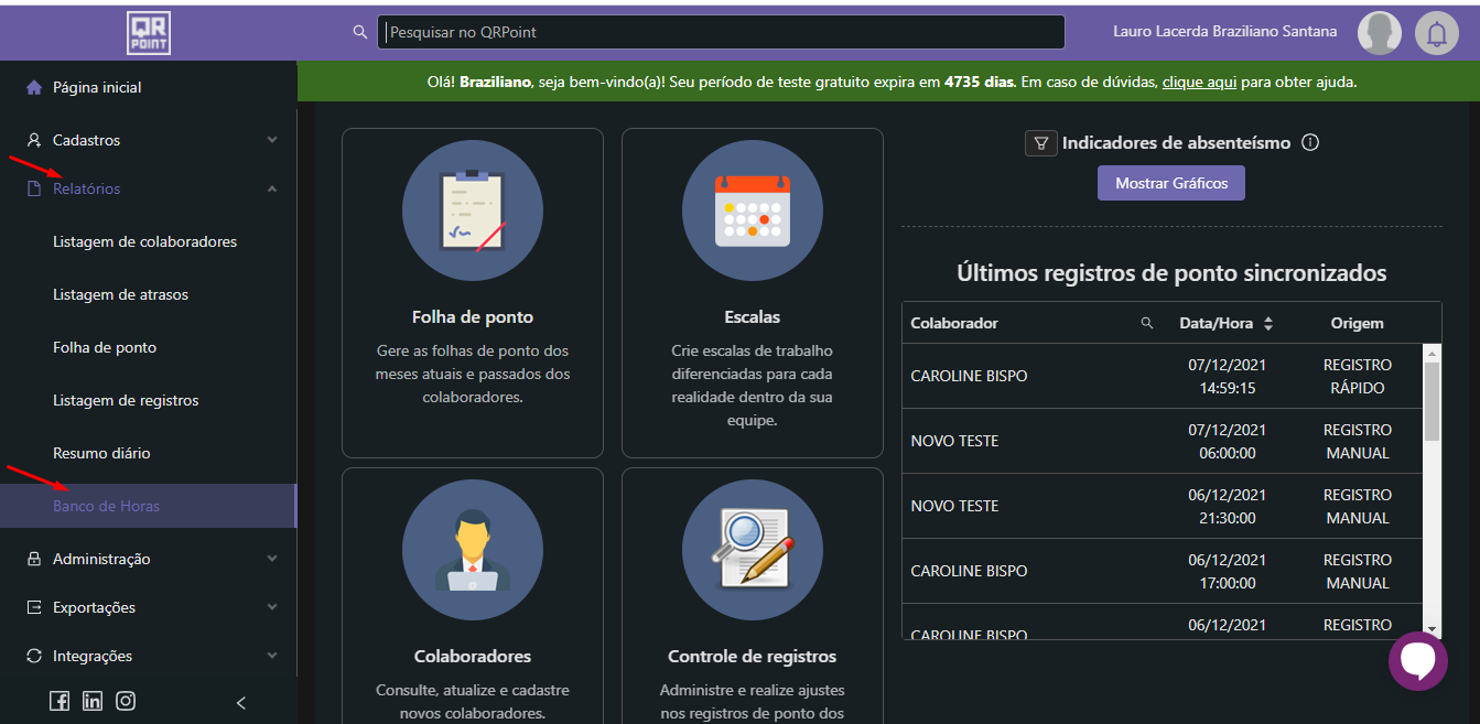 No menu, clique em RELATÓRIOS > BANCO DE HORAS.