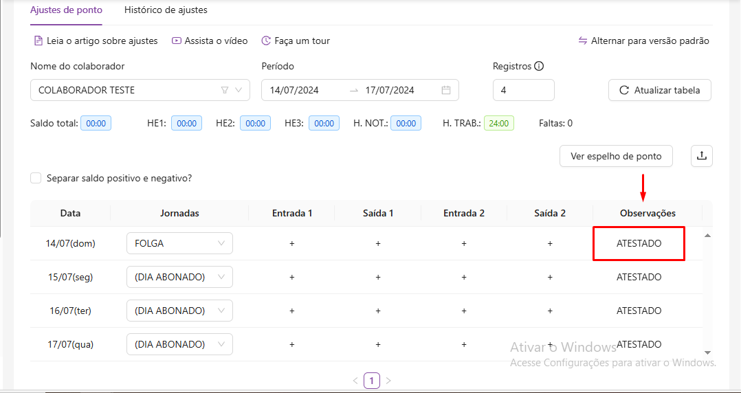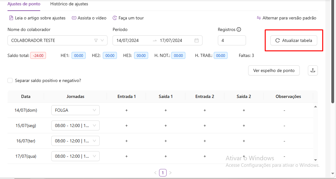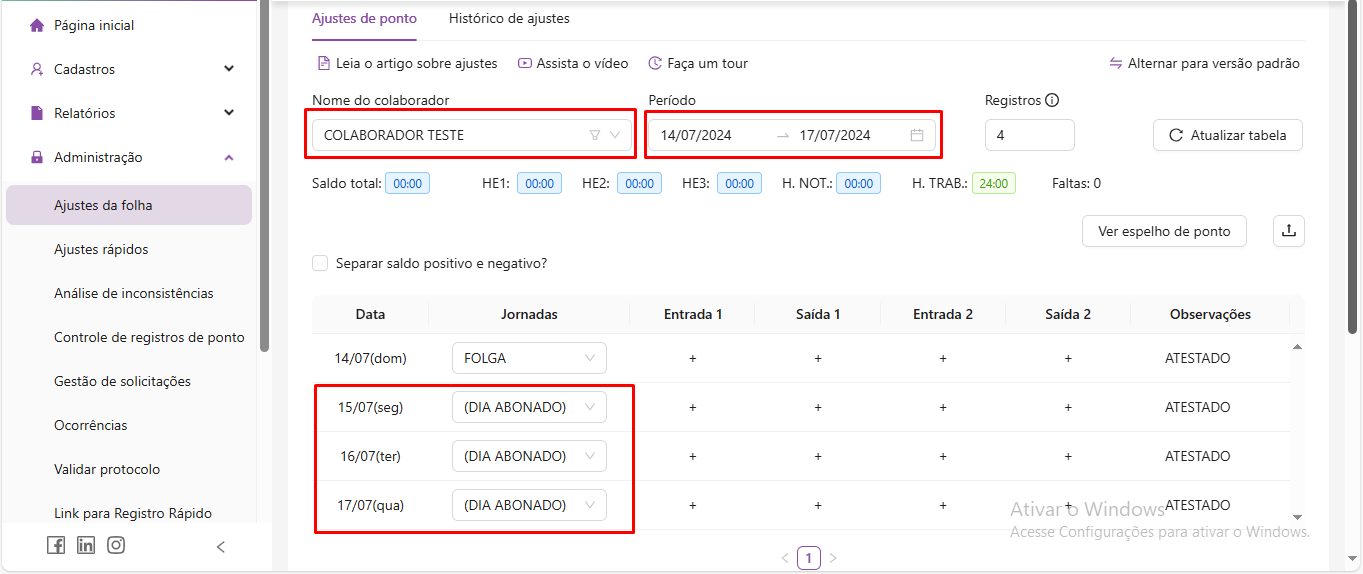 Depois é só atualizar a tabela para que nos campos onde estavam descritos como "ABONO" apareça a jornada do dia do colaborador.