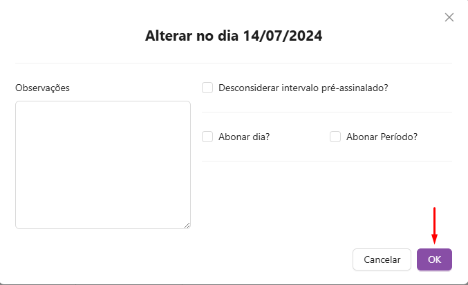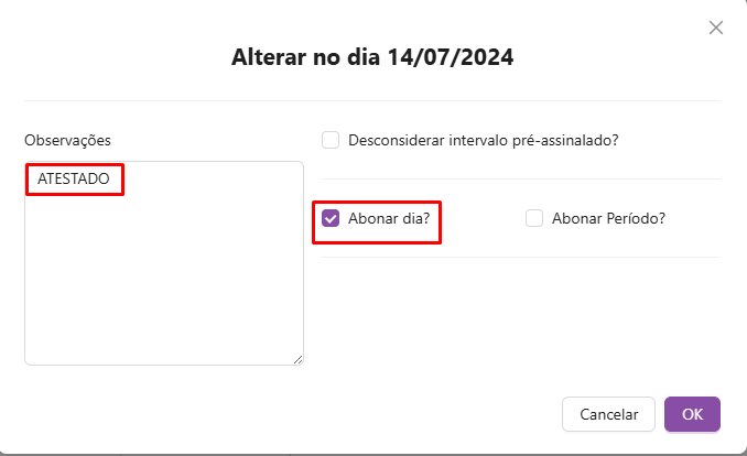 Você deve desmarcar a opção "Abonar dia?" e remover a observação feita no campo de observação e depois clicar em "ok" para salvar a modificação feita.