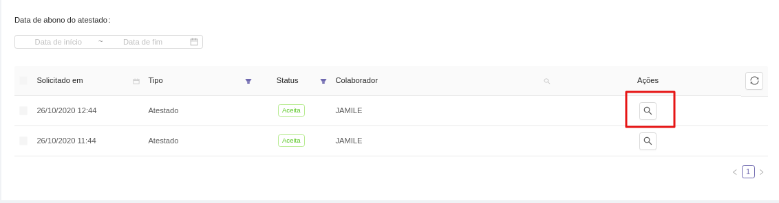 Em seguida, irá aparecer todas as solicitações de atestado e você clica na lupa do atestado que deseja revogar.
