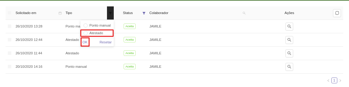 É possível também filtrar o tipo de solicitação apenas para atestado.