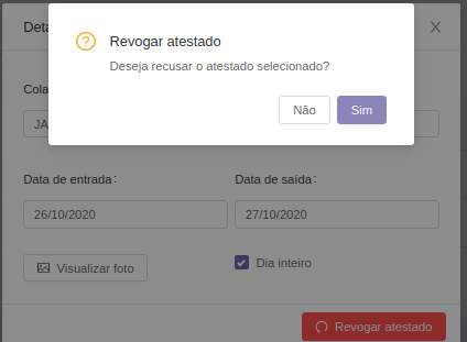 Dessa forma, irá aparecer as informações dessa solicitação e você clica em revogar atestado.
