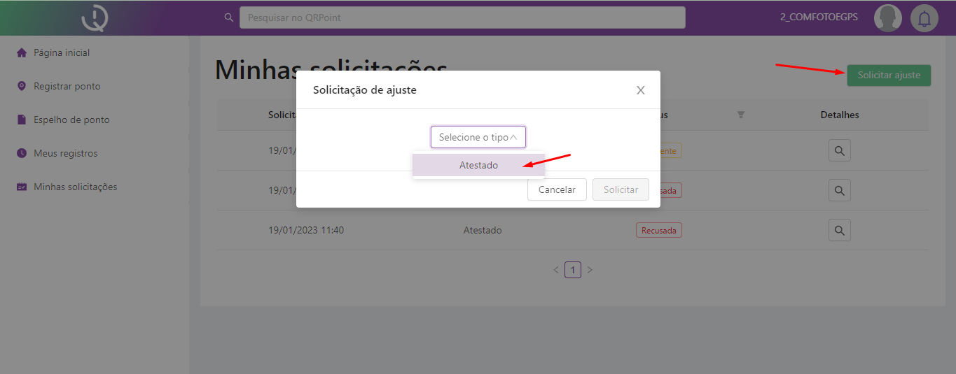Para inserir sua solicitação de atestado, clique na aba se Solicitar Ajuste e logo após escolha a opção Atestado: