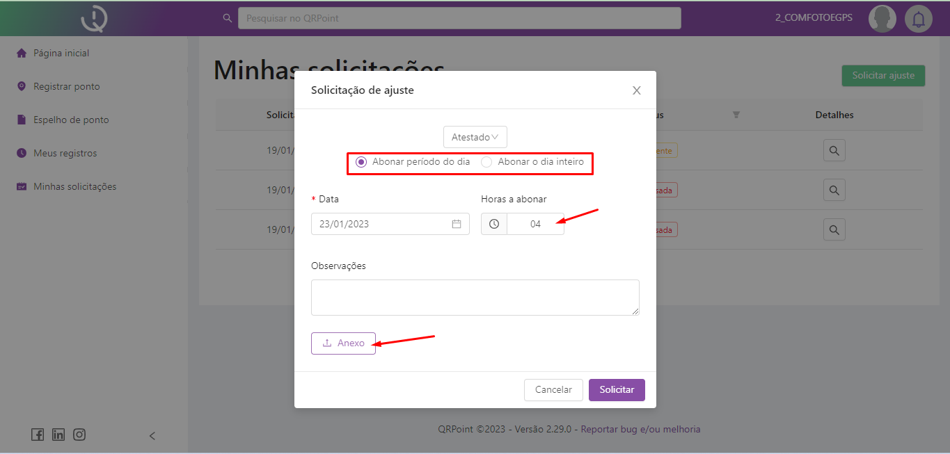 As opções de configuração vão aparecer ao selecionar a palavra ATESTADO , você vai poder escolher abonar o dia todo ou somente um período do dia, e atenção, um anexo precisa ser selecionado para que a solicitação seja feita!