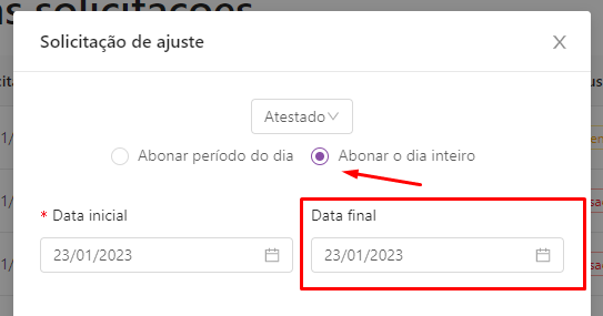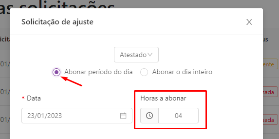 Observação: Ao selecionar a opção de ABONAR O DIA INTEIRO, você ajusta a data inicial e final do abono, e quando selecionar a opção ABONAR PERÍODO DO DIA, é necessário se colocar as horas totais abonadas naquele dia, como ilustram as imagens abaixo: